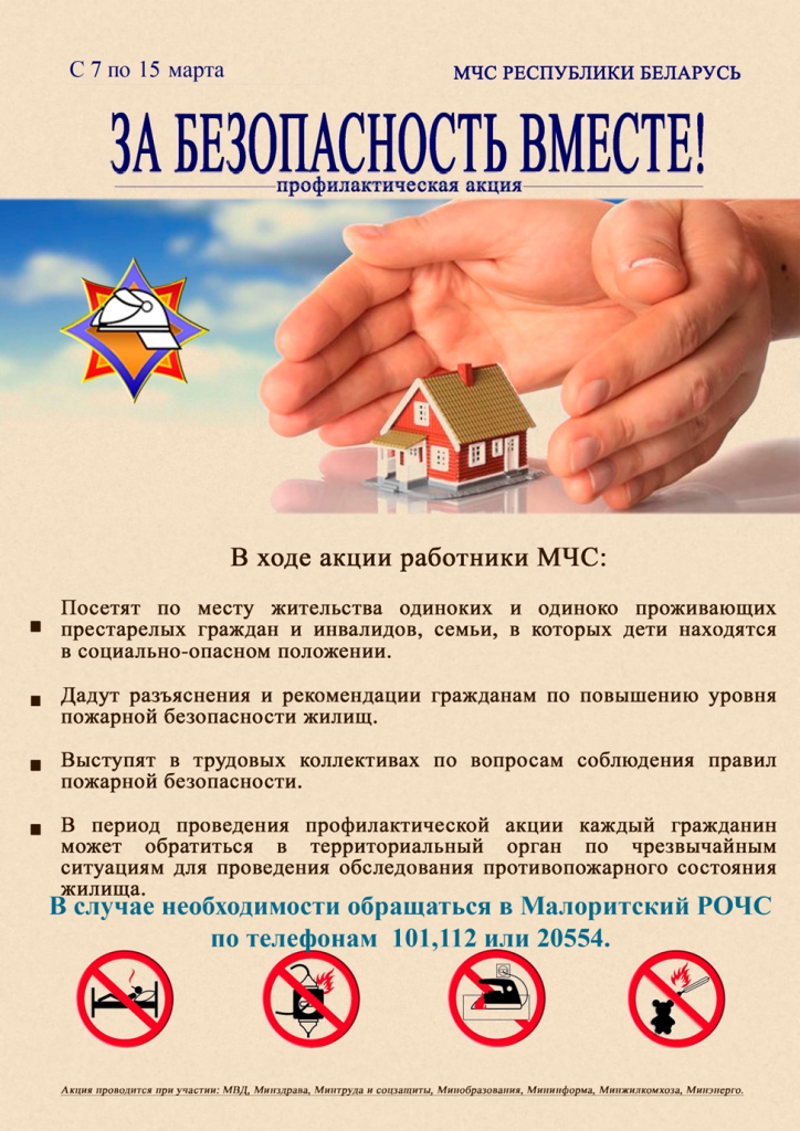 Помните, что в соответствии с законодательством Республики Беларусь ответственность за соблюдение требований пожарной безопасности в жилых домах, принадлежащих гражданам на праве частной собственности, возложена на их собственников.В период проведения акции каждый гражданин может обратиться в Малоритский районный отдел по чрезвычайным ситуациям (г. Малорита ул. Маруды, д.52) для проведения обследования противопожарного состояния своего домовладения по телефонам 101,112 или 20554.